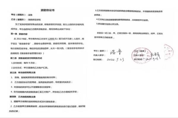 生科院关工委主任任守军与温鲁签署资助协议书,协议于每年九月捐助12000元给生科院关工委,生科院关工委承诺公平公正地使用这笔资金,每次资助五名学生,每位学生拟资助四年。