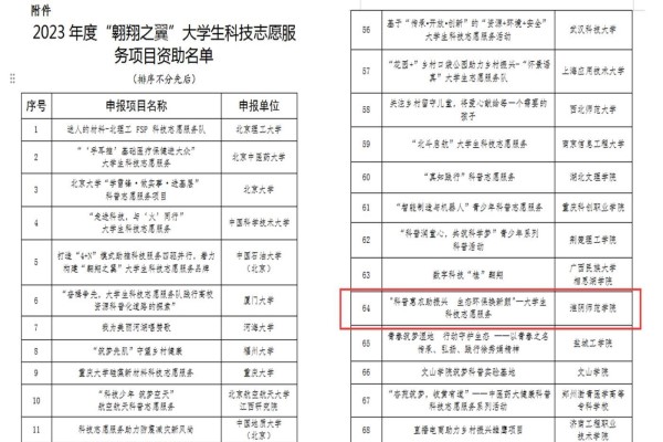 近日,中国科协宣传文化部公布了2023年度“翱翔之翼”大学生科技志愿服务评审结果,生科院学生志愿服务团队乡村振兴项目“科普惠农助振兴 生态环保换新颜”-大学生科技志愿服务项目获得立项资助。据悉,此次共有476家相关单位申报,经形式审查、专家评审、经费审核、部门研究等程序,最终确定北京大学等100家资助单位。