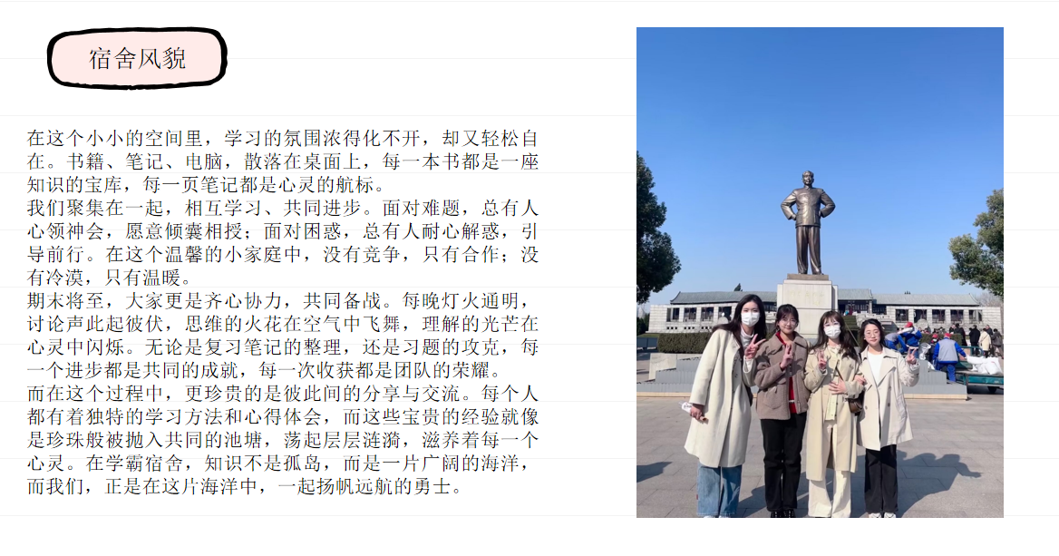 3月30日至4月15日进行了活动的第二阶段——风采展示工作,由获得一等奖的学霸宿舍制作ppt,并向同学们展示了宿舍风采,分享了学习经验。获得二等奖的学霸宿舍制作了word文件和学院同学们分享,展示宿舍成员的学习成果和学习心得。