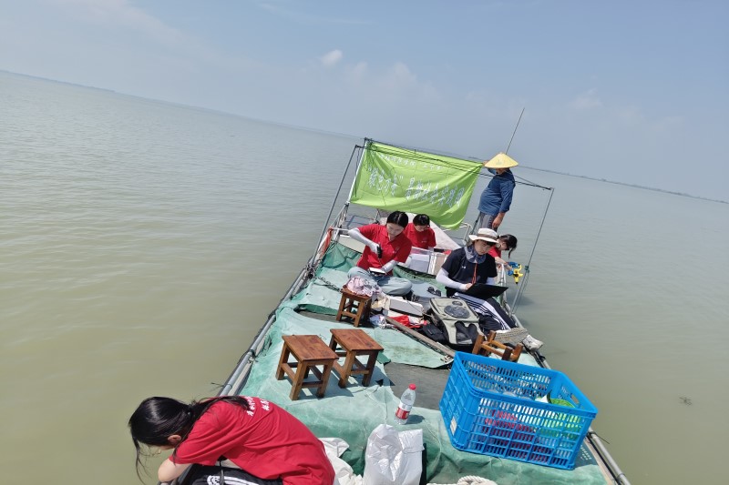 在指导老师的带领下,依据前期确定的采样地点,实践团分工合作,利用采水器等设备,对洪泽湖进行采样,同时进行水体光谱、透明度等参数测量。团队成员方向明确,积极配合,经过三天完成了采样工作,并将采得样品放置冰箱贮存以便后续指标测定。