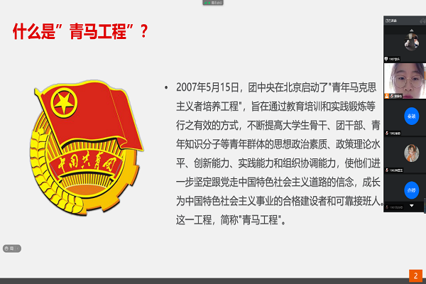 会议分为学干工作经验分享、青马工程思想学习、思想交流三部分内容。会议伊始,团委宣传部长黄静怡就团委基本工作、新闻宣发、新媒体使用等进行了工作经验的简单分享。随后,黄静怡又带领学生进行了青马工程发展历史及其意义的简单了解,她强调:“在各种思想文化相互激荡的环境中,广大青年思想活动的自主性、选择性、多变性、差异性明显增强。在此背景下,能否培养和造就一大批用马克思主义中国化的最新成果武装起来的青年马克思主义者,将关系到我国改革开放伟大事业的成败,在校大学生开展青马工程具有十分迫切与必要的意义。”最后,多名团委学干参与青年马克思主义、习近平新时代中国特色社会主义思想相关理论的研讨,大会进行顺畅,反响热烈。