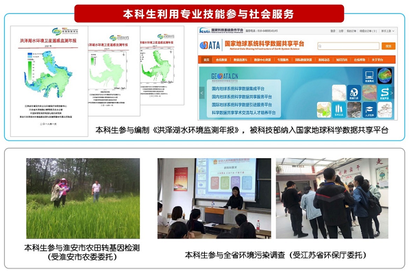 师生连续多年编制《洪泽湖水环境监测与蓝藻预警年报》,被科技部纳入国家地球科学数据平台,并在相关部门管理决策中得到应用;多次参与淮安市农田的转基因检测普查,并作为《转基因农产品检测技术》特色课程和学生技能训练的重要内容,也为当地农业执法部门提供了参考。