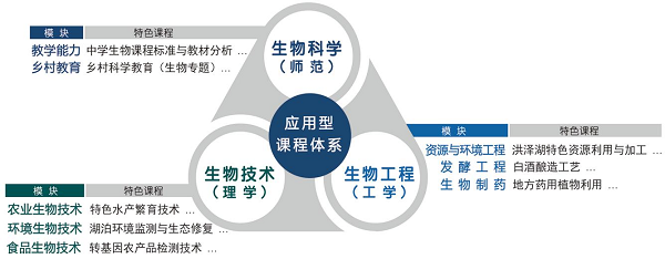 强化课程模块的地方应用型特色,培养学生家国情怀,助推乡村振兴。如生物科学专业设置乡村教育模块,招收乡村教师定向培养班,开设“乡村科学教育”特色课程;生物技术专业开设“特色水产繁育技术”、生物工程专业开设“洪泽湖特色资源利用与加工”等地方特色课程。