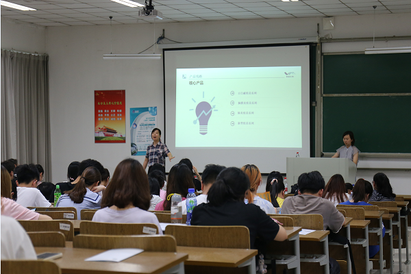 讲座开始,徐虹经理就以自身经历来引导学生对创新创业的认识,着重强调了“创新训练计划”、“创业训练项目”、“创新实践项目”三个部分,并就以上三个部分对学生提出期望。徐经理提到,创业需要理性,也离不开超群的能力,还需掌握大量的资源,他鼓励学生敢于尝试,勇于尝试,多参与实践活动。