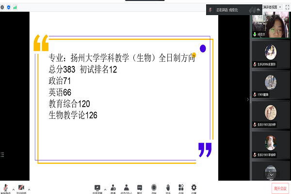 为引导学院学生树立正确考研目标,进一步推进学院考研工作高质量发展。生科院2022年考研经验分享会于5月8日以线上会议形式举行。分享会由辅导员李小团主持,2018级7位优秀毕业生和全体2019级学生参加会议。