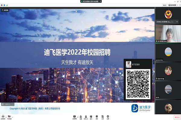为贯彻落实党中央、国务院“稳就业”“保就业”决策部署和积极推进学校“访企拓岗促就业”专项行动活动要求,最大程度减少疫情对毕业生就业带来的影响,进一步拓宽毕业生就业渠道,促进毕业生充分就业和高质量就业。6月3日晚,我院邀请迪飞医学科技(南京)有限公司于线上召开招聘会。