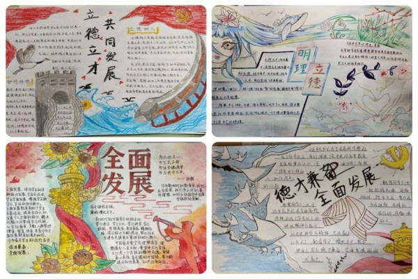 活动中,同学们认真了解"德才兼备 全面发展"教育月的相关内容,并且从中提炼手抄报主题,围绕"德才兼备"和党的二十大精神,结合实际,突出亮点,图文并茂。通过鲜艳的油彩与清秀的文字,生动表达了自己对“才与德“的深入思考,绘制了一幅幅形象生动的手抄报作品。