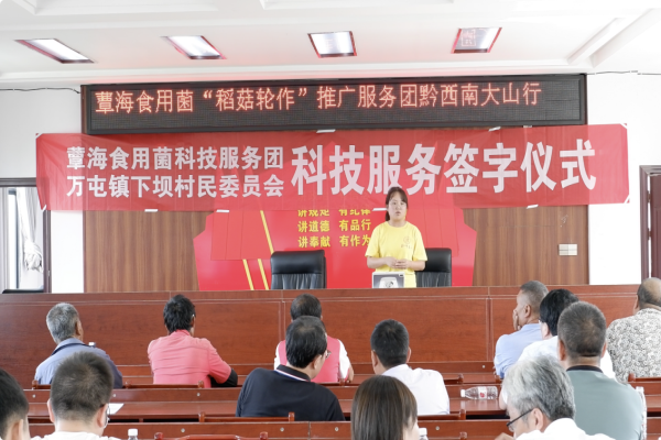 服务团在义龙新区万屯镇下坝村实地考察了坝上稻田,走访村民了解水资源情况,在当地政府的支持下,服务团与下坝村村委会签署了“稻菇轮作”技术服务协议,并现场举办“稻菌轮作”技术培训会。
