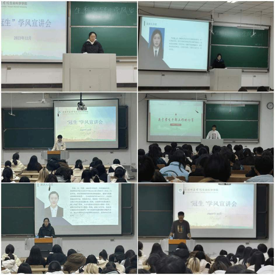 为了加强学院学风建设,营造良好的育人环境和学习氛围,充分发挥学生先进典型示范作用,生科院精心挑选国家奖学金获得者、优秀学生干部等六名学生组成生科院“冠生”学风宣讲团,并于近日在2023级、2022级学生班级中开展学风宣讲活动。