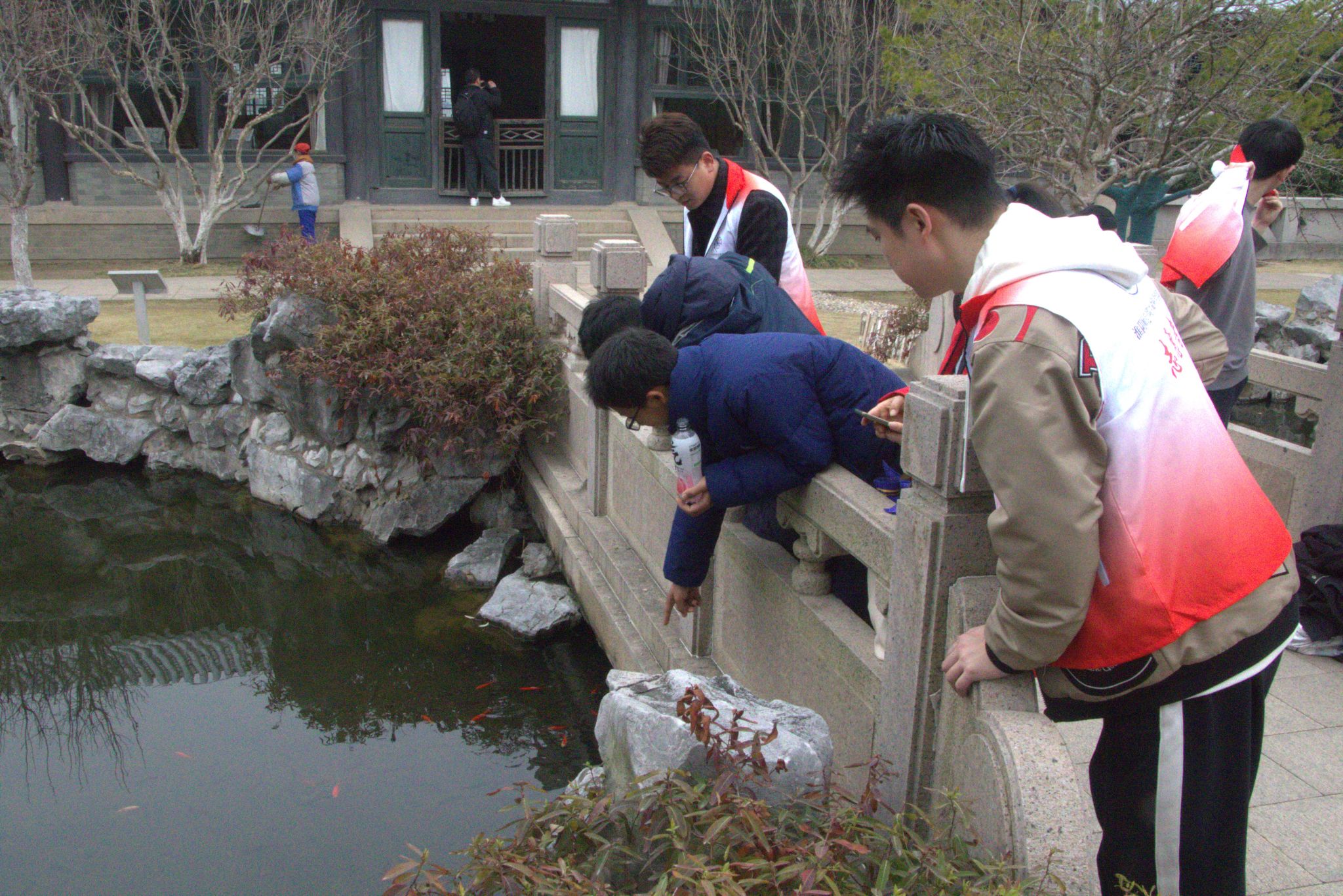 来到西花厅,不禁让人想起来那首《西花厅的海棠花又开了》。院子里的海棠花还未开放,但是依然游客如织。同学们热情地向游客们介绍着植物和鱼类的名称、习性、生长环境以及它们在生态系统中的作用。用通俗易懂的方法讲解了植物的光合作用、净化空气、保持水土等重要作用。